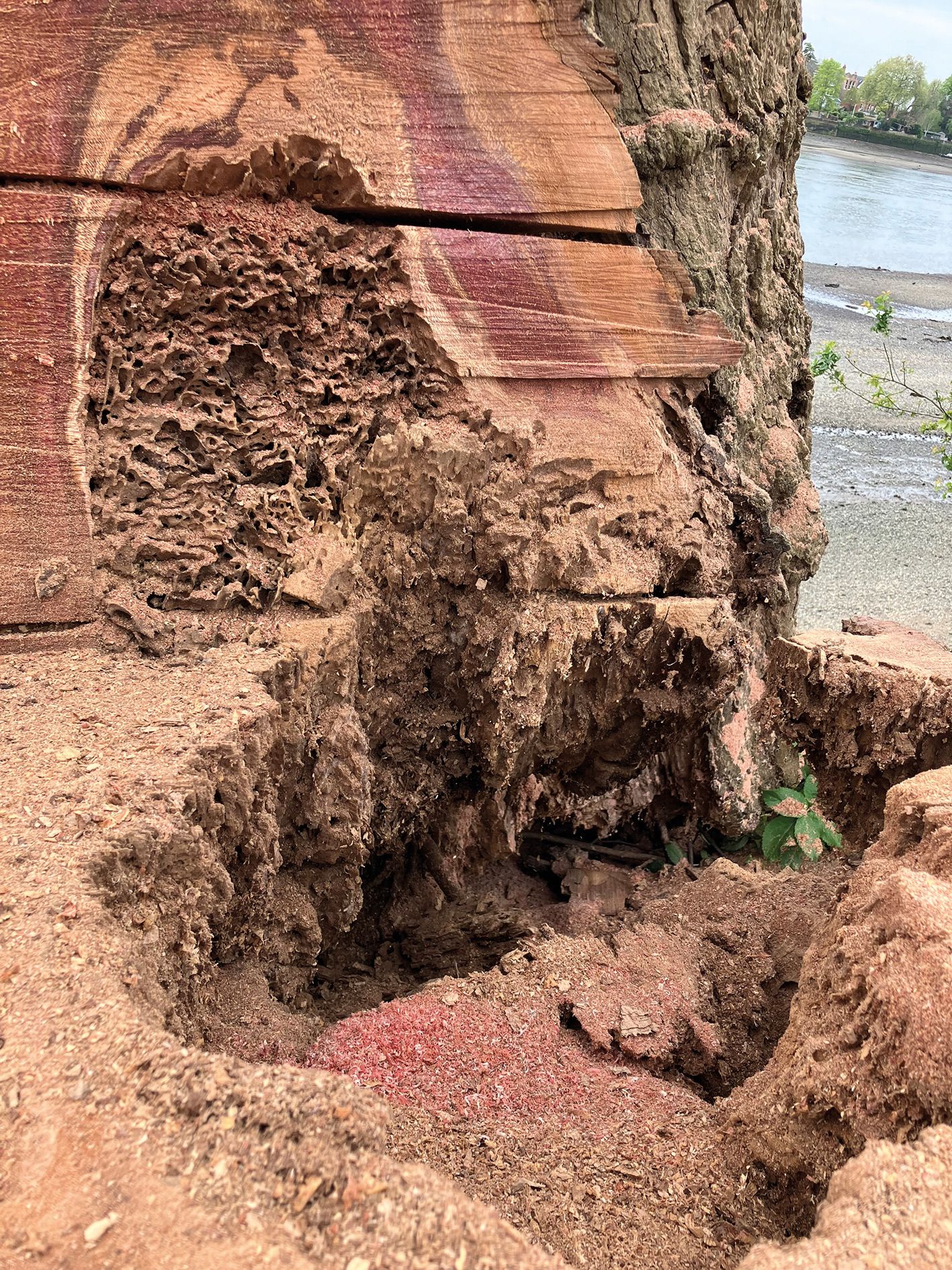 Sadly, one of the Club’s oldest trees, a once magnificent Plane sited on the riverbank, adjacent to the Outdoor Pool carpark, has recently had to be removed. The tree was heavily pollarded in 2019, when tree surgeons became aware of rot in its higher branches, which posed a serious health and safety risk. The substantial monolith left behind continued to sprout and provide fresh growth every season, but Head of Grounds & Gardens, Neil Harvey, discovered a hole beside the trunk. On further investigation, this hole was found to be a portal to a cavern three metres deep and about as wide, creating a potential breech in the flood defence.