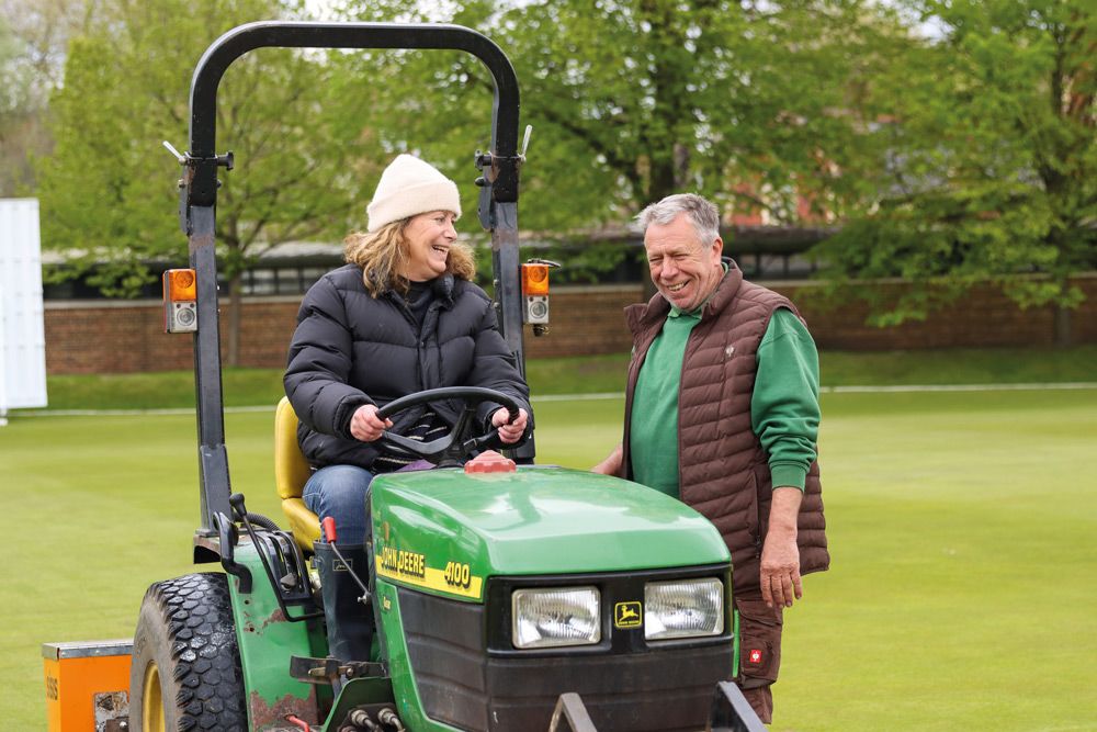 I set off with Tom and the first stop is the Cricket Ground, where under the watchful eye of Groundsman, Paul Brind, I clamber onto a roller machine to help with maintenance and pitch seeding.