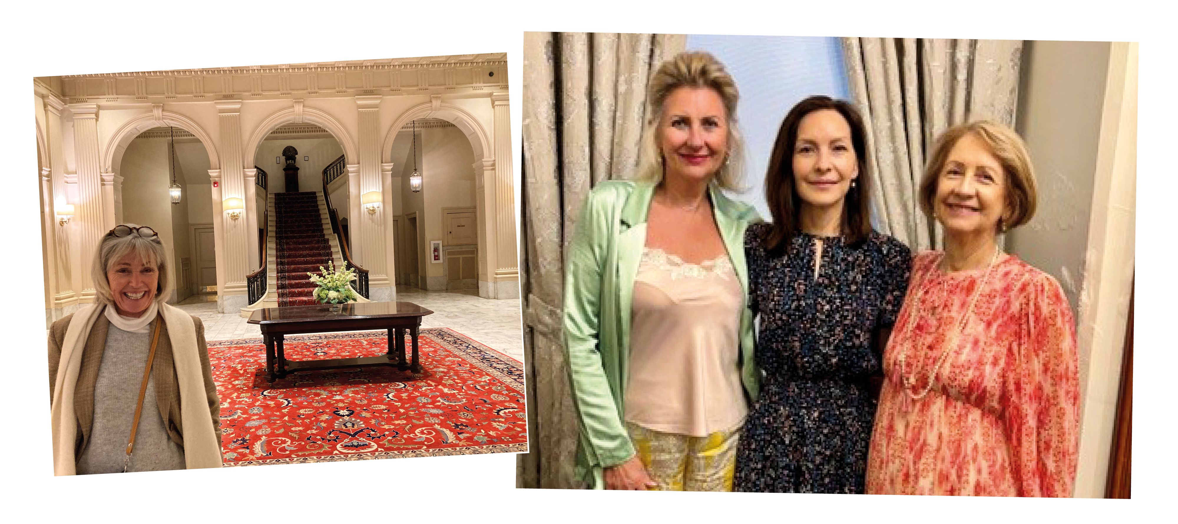 Main: Drawing Room of Union Club, Victoria. Left: Philippa in the Racquet Club of Philadelphia. Right: Monica with friends at Perth’s Weld Club