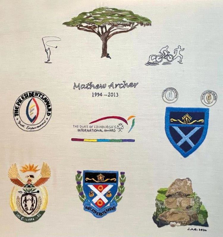 Stitched by Jenny Gane, this piece took three years to complete and was recently given to the mother of this young man called Matthew, who passed away aged 19. Each symbol represents the various stages and accomplishments that Mathew achieved during his short life